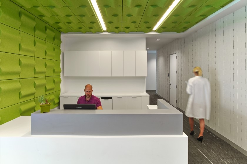 顔色和紋理合爲一體,您可以在任何地方吸收聲音。這些裝飾性的聚酯纖維闆採用中性大膽的顔色,就像這裏看到的綠色纖維闆一樣,可以排列成各種不同的圖案,使您的牆壁和天花闆看起來像是流動的。通過在天花闆上安裝相同的圖案,然後沿著牆壁向下安裝,可以使這些隔音闆在房間中流動。