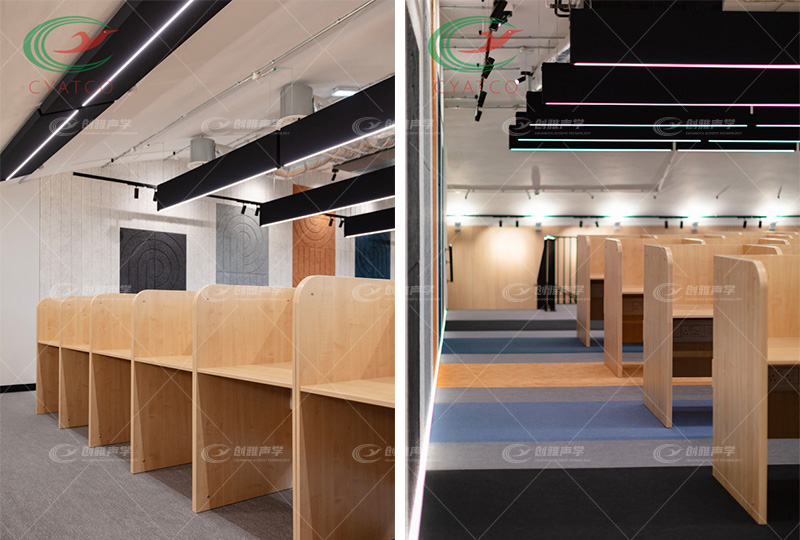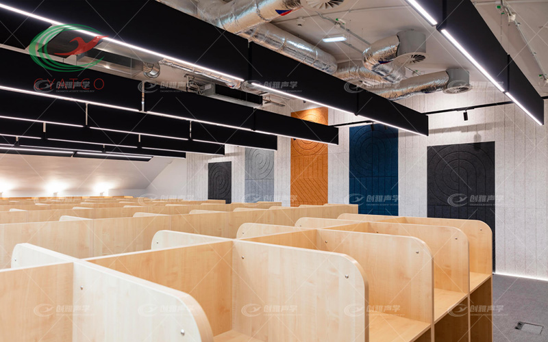 本案例是在學校裏的圖書館自習室,噪音幹擾是一個常見的問題,包括來自教室、走廊、操場和其他活動場所的噪音。空間吸聲體的應用可以有效地吸收和減少這些噪音,降低學生在學習和考試時受到的幹擾。如在教室和圖書館中安裝吸聲闆,可以顯著降低聲音的反射和回聲,提供一個安靜的學習環境。