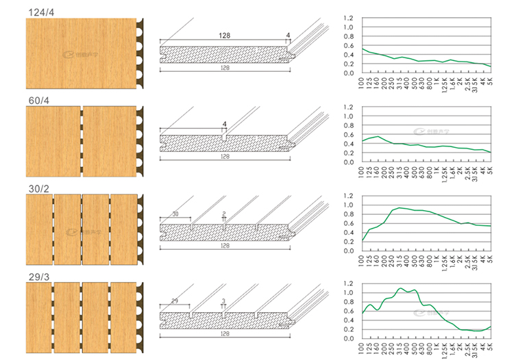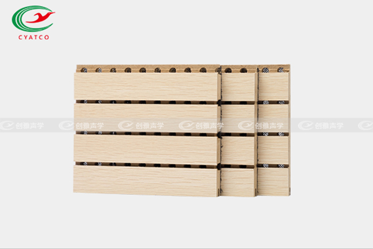 在聲學功能方面,槽木吸音闆是一種狹縫共振吸聲材料,具有優秀的吸音降噪功能,尤其對(duì)中、高頻的聲音效果尤爲顯著。槽木吸音闆是由密度闆正面開槽、背面穿孔加上吸音氈組成的吸音材料,飾面可以根據風(fēng)格需求定制,有各種實木貼面、烤漆面、油漆面和其他飾面,常用規格有2面1槽、3面2槽、6面5槽等,不同型号的吸聲系數也不同